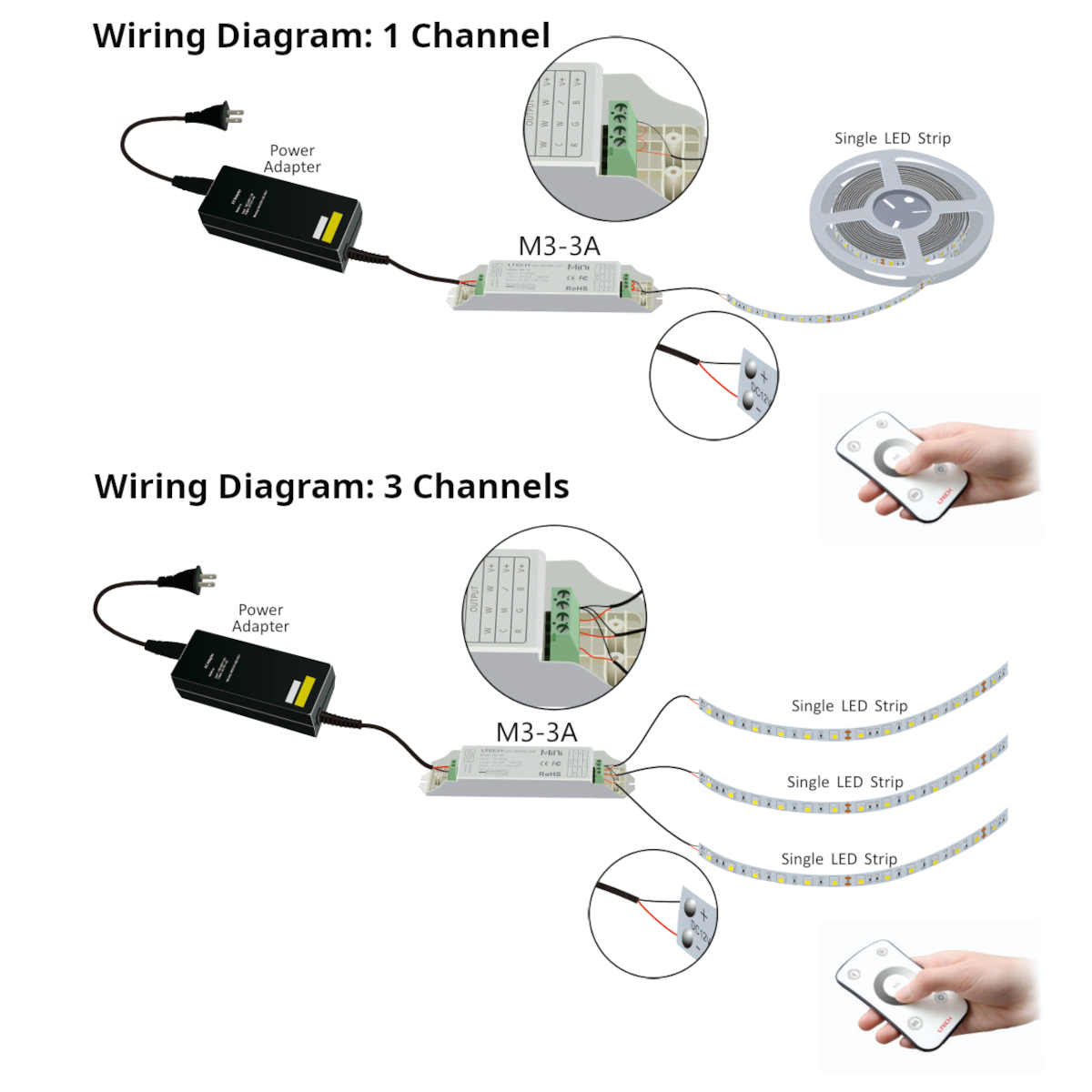 With a 3 x 3AÂ output channels, each channel is suitable for up to 36W of 12V strip or 72W of 24V strip, this controller suits most residential and light commercial LED strip applications. Its small size makes it easy to hide inside cabinetry, ceiling spaces, or behind panels.
