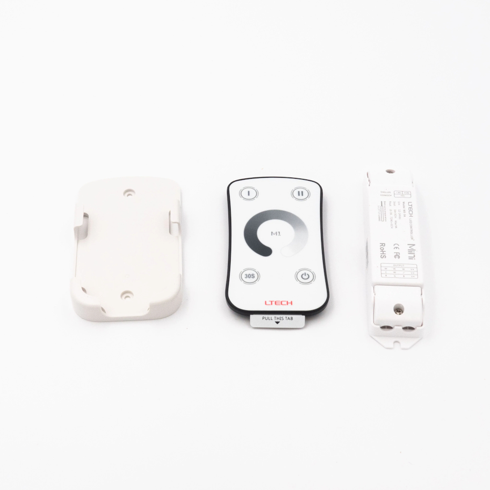 The Ltech M-Series Mini Controller is a compact solution for remote controlling and dimming your single colour 12–24V LED strip lighting. The RF handset provides reliable control without needing line-of-sight.
