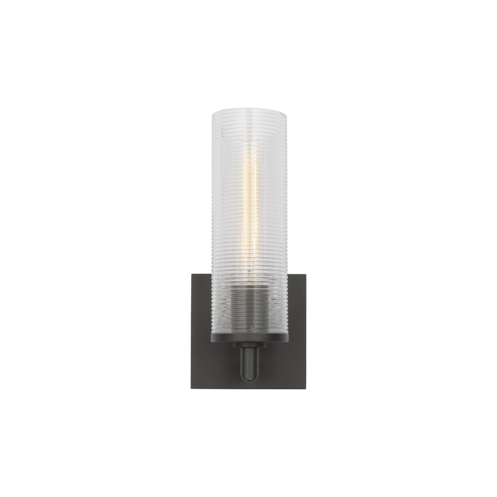 The Sarita Single Wall Light features a ribbed clear glass shade mounted on a compact steel frame. The ribbed glass softly diffuses the light, reducing glare and creating a comfortable, even glow.
