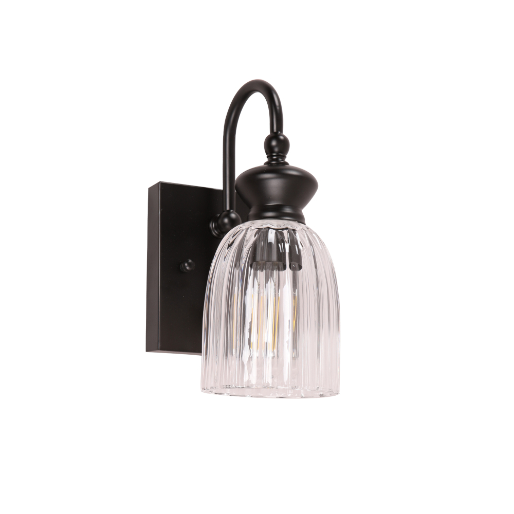 The Sino Wall Light combines a curved metal arm with a traditional-style lampholder, finished in Black or Brass. A ribbed clear glass shade catches the light, adding texture and sparkle to hallways, bedside tables, or bathroom vanities.